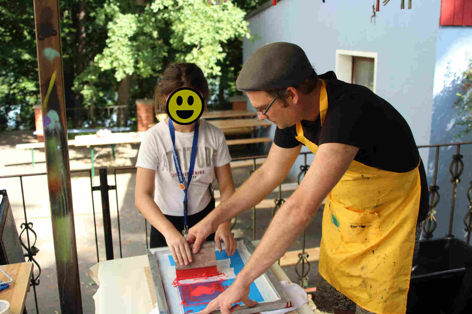 - Druckphase: Gemeinsam drucken wir auf Papier, Textilien oder mitgebrachte Kleidung, entweder Motive aus unserem Repertoire oder selbst entwickelte.